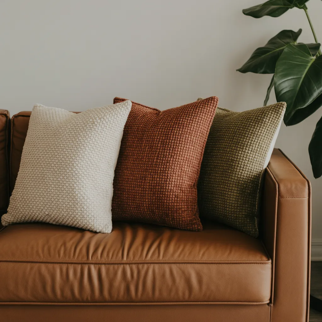 Throw pillows are the easiest way to change the look of your brown couch. Mix different textures — velvet, linen, knit, faux fur — in complementary colors like cream, rust, navy, or olive.