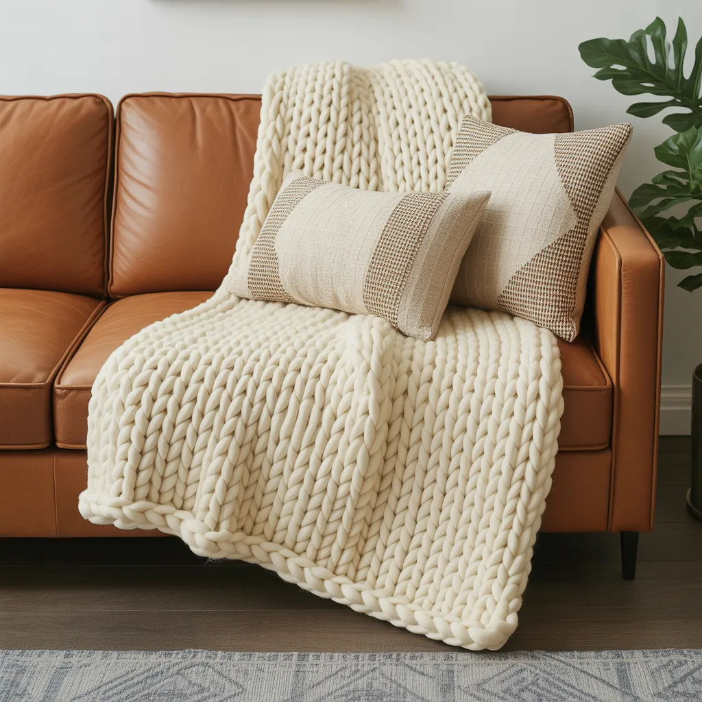 A chunky knit throw blanket draped over your brown couch adds instant warmth and coziness. It’s a small addition that makes a big difference, especially in cooler months.